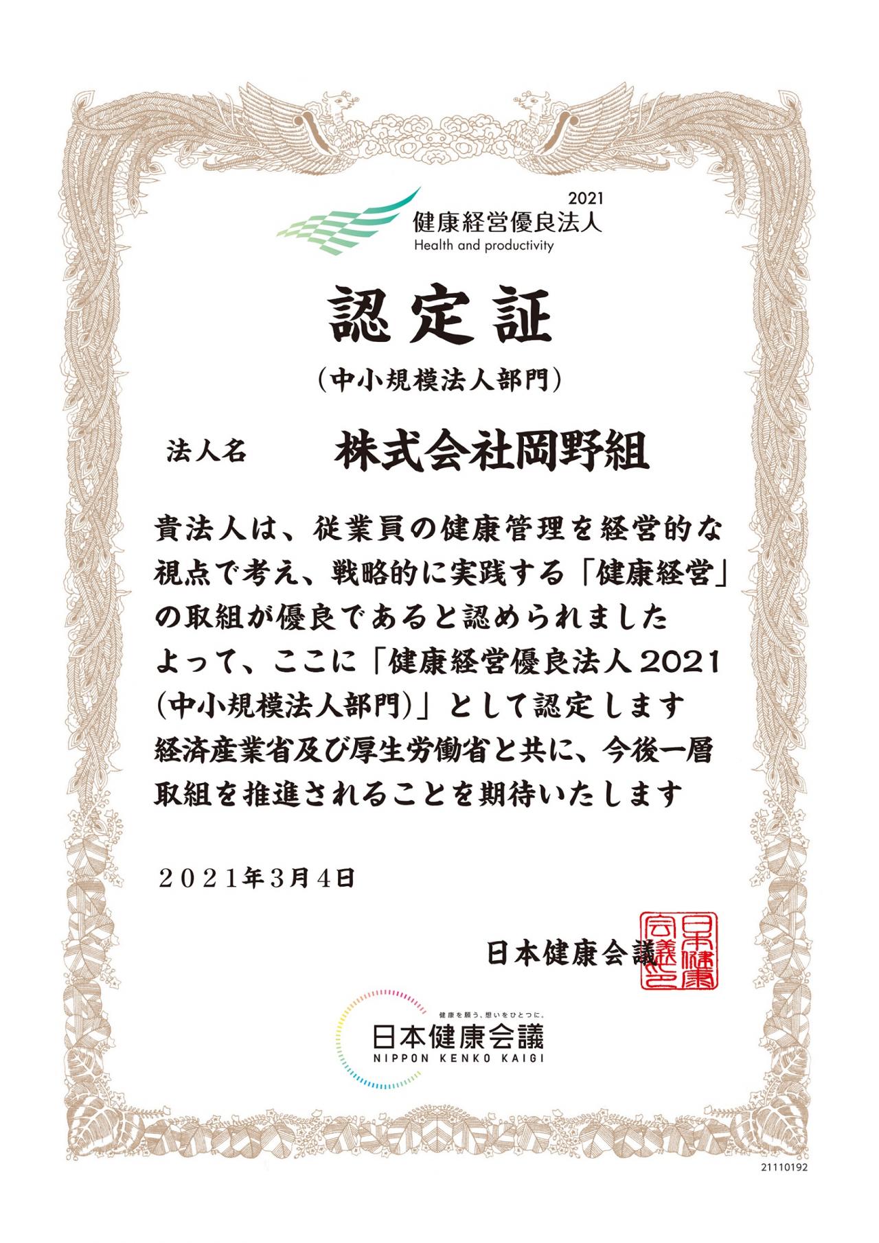 健康経営優良法人2021(中小企業法人部門)の認定を受けました