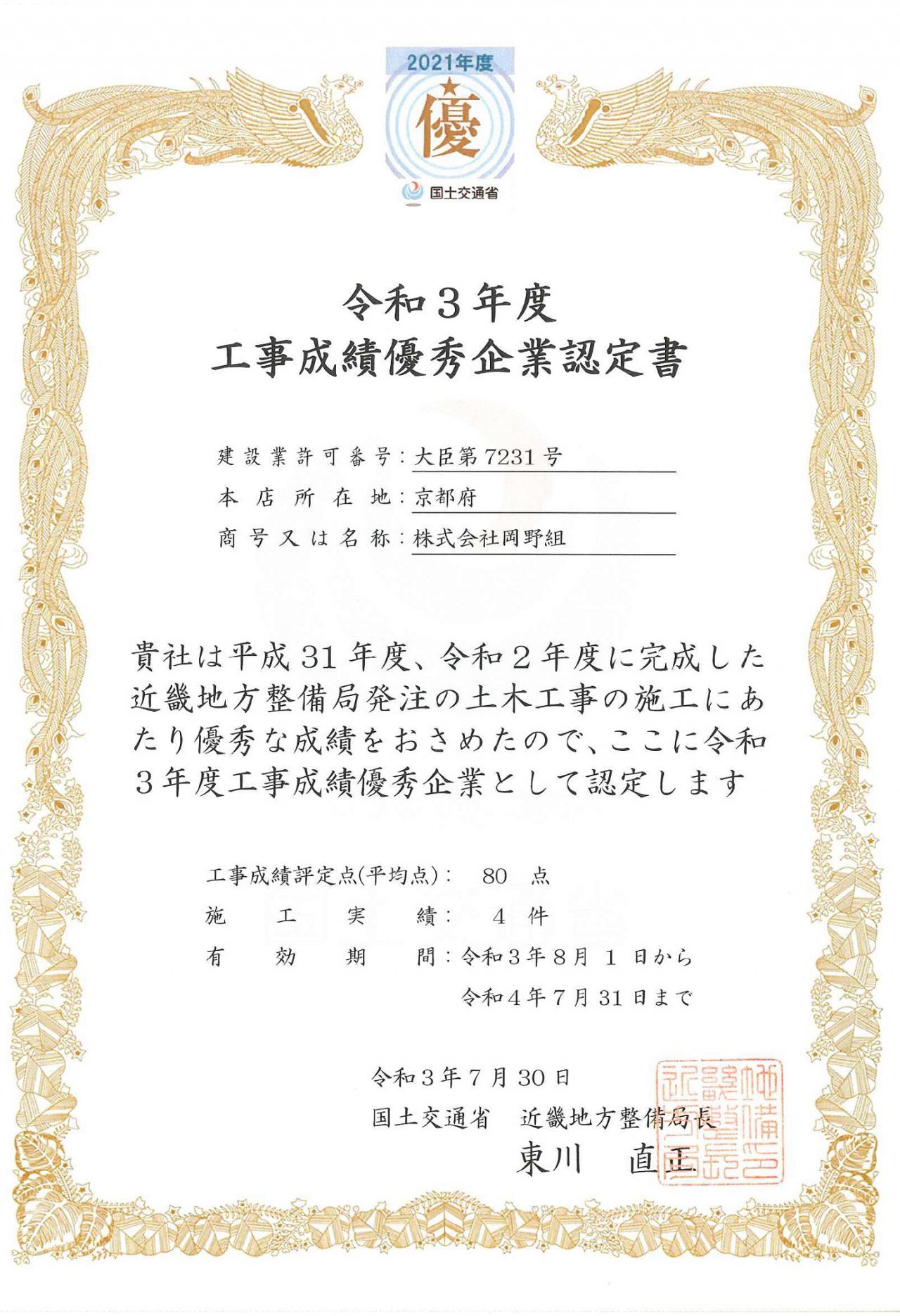 この度、当社は国土交通省 近畿地方整備局長様より令和3年度工事成績優秀企業認定を受けることができました。